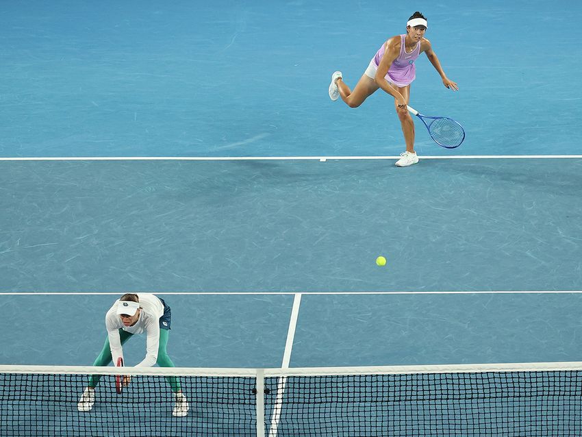 MELBOURNE, AUSTRALIA - JANUARY 29: Ena Shibahara of Japan and Vera Zvonareva talk tactics during their Women's Doubles Semifinal match against Elise Mertens of Belgium and Shuai Zhang of China during day 12 of the 2026 Australian Open at Melbourne Park on January 29, 2026 in Melbourne, Australia. (Photo by Kelly Defina/Getty Images)