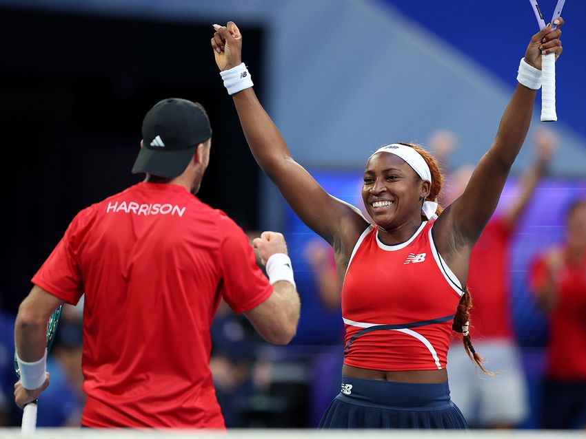 準々決勝ギリシャ戦でチームの勝利を決める2勝目を挙げたココ・ガウフ(右)/クリスチャン・ハリソン(アメリカ)(Getty Images)