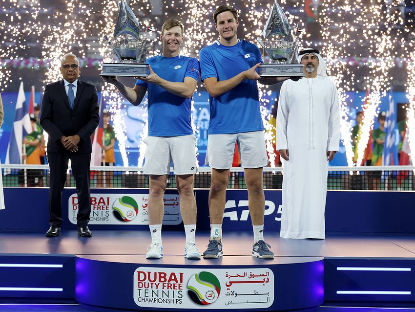 DUBAI, UNITED ARAB EMIRATES - FEBRUARY 28: Harri Heliovaara of Finland and Henry Patten of Great Britain pose with the trophies during the presentation ceremony after their victory in the Men's Doubles Final against Marcelo Arevalo of El Salvador and Mate Pavic of Croatia on day fourteen of the Dubai Duty Free Tennis Championships at Dubai Duty Free Tennis Stadium on February 28, 2026 in Dubai, United Arab Emirates. (Photo by Christopher Pike/Getty Images)