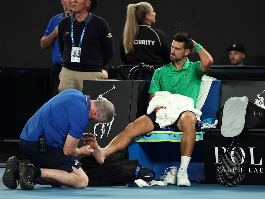 第3セットで痛めた右足首の治療を受けるノバク・ジョコビッチ(セルビア)(Getty Images)