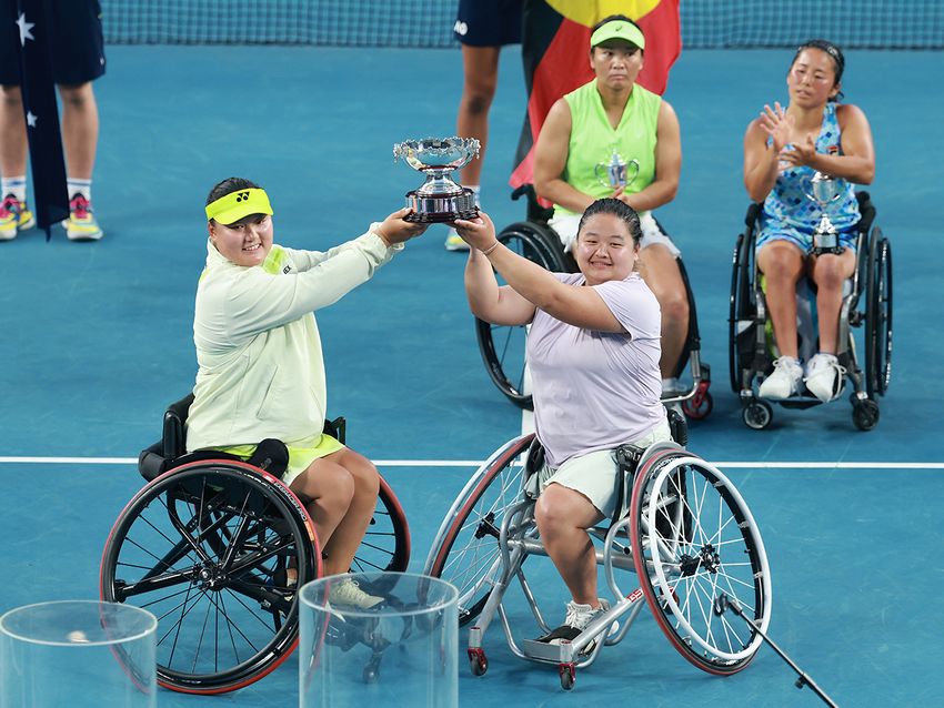 MELBOURNE, AUSTRALIA - JANUARY 30: Winners Xiaohui Li (L) and Ziying Wang (R) of China lift the trophy after the Women's Wheelchair Doubles Final against Yui Kamiji of Japan and Zhenzhen Zhu of China during day 13 of the 2026 Australian Open at Melbourne Park on January 30, 2026 in Melbourne, Australia. (Photo by Lintao Zhang/Getty Images)