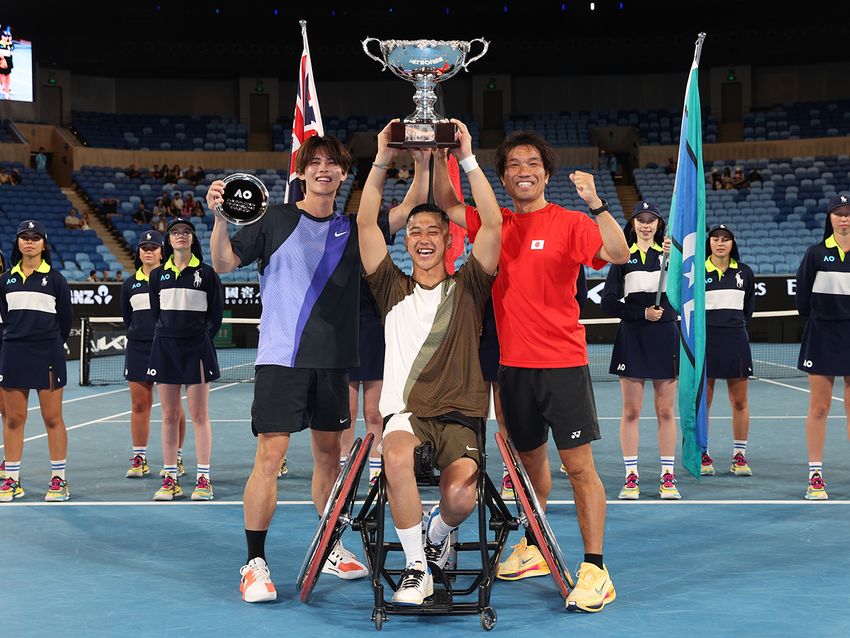 MELBOURNE, AUSTRALIA - JANUARY 31: Tokito Oda of Japan poses with his coaching staffs after his victory in the Men's Wheelchair Singles Final against Martin De la Puente of Spain during day 14 of the 2026 Australian Open at Melbourne Park on January 31, 2026 in Melbourne, Australia. (Photo by Kelly Defina/Getty Images)
