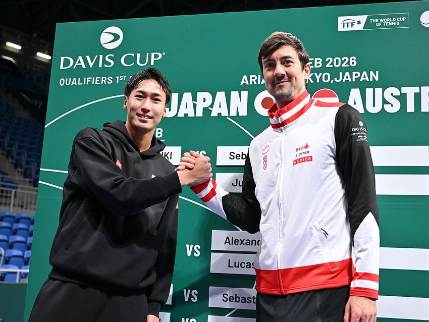 組み合わせ抽選のあとに行われたフォトセッションでの綿貫陽介(SBC メディカルグループ/左)とセバスチャン・オフナー(オーストリア)(Getty Images)