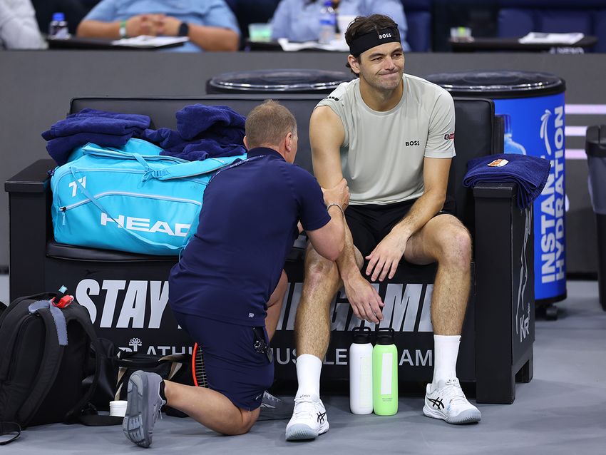 チェンジエンドで理学療法士の治療を受けるテイラー・フリッツ(アメリカ/右)(Getty Images)