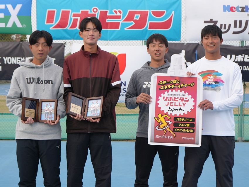 左から男子ダブルス優勝の石井貴哉(佐土原高校)、稗田光(関西高校)、準優勝の山口慶二(YELL)、小林良輔(浪速学院)(©ヨネックス)