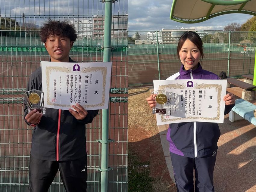 シングルスは加羽澤龍之介(近畿大1年)と成田百那(同志社大1年)が優勝 [R7関西学生新進戦]