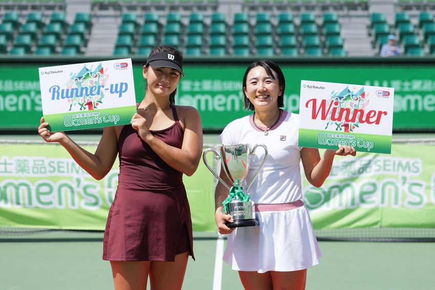 女子シングルスで優勝を飾った岡村恭香(橋本総業ホールディングス/右)と準優勝のヒナ・イノウエ(アメリカ)(写真提供◎富士薬品セイムスウィメンズカップ、撮影◎眞野博正)