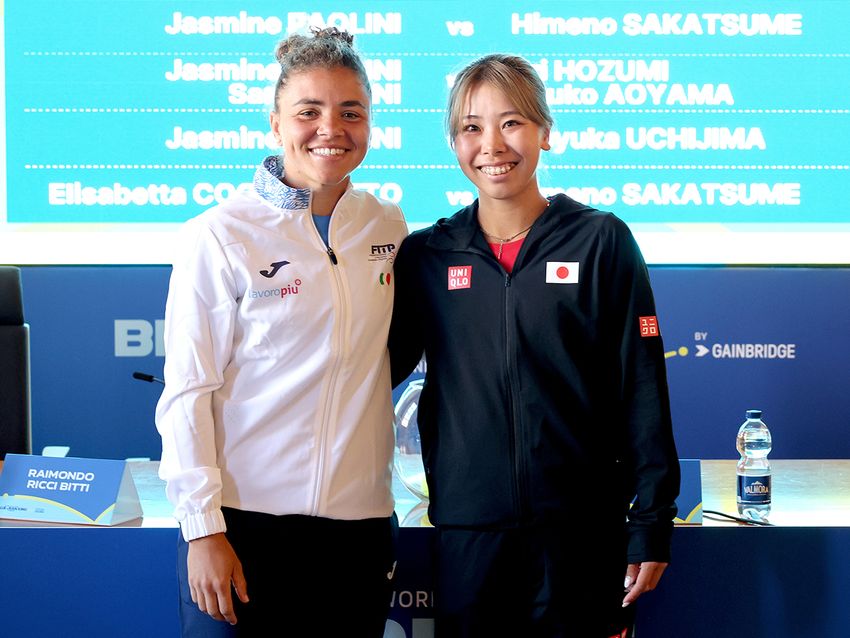 組み合わせ抽選会での坂詰姫野(橋本総業ホールディングス/右)とジャスミン・パオリーニ(イタリア)(Getty Images)